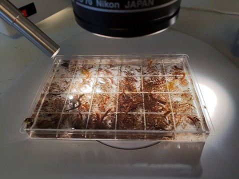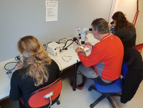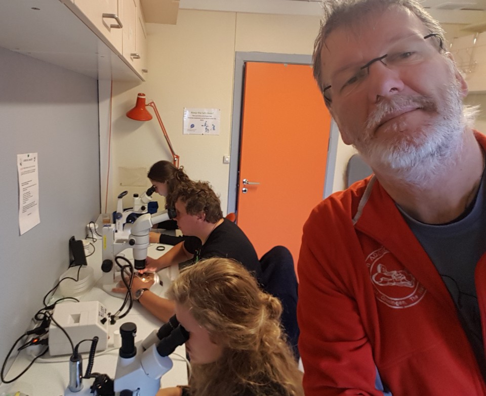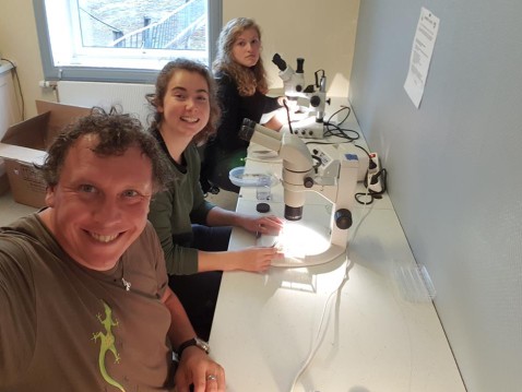 | The second sample of bentic lake fauna. Now they have to catch all moving little critters and put them in ethanol for later identification. This was the first time I saw Ostracods. A new revelation, similar to my first encounter with Lepidurus, the tadpole shrimp. From front to back, Sanne Moedt, Christoph Brochard and Marlon de Haan behind the binoc. | |