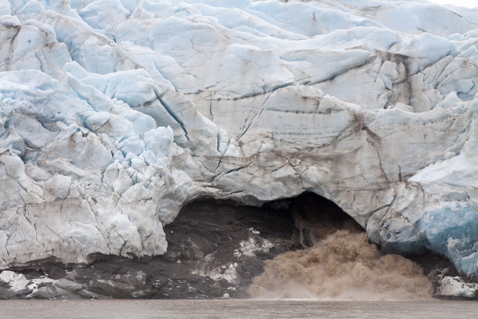 Dichtbij de gletsjer is het water rood gekleurd van het ijzerhoudend sediment dat het fjord in stroomt. Het zoete water van de gletsjerrivier vormt een toplaag op het zoute fjordwater. Het fjordwater zelf, onder de troebele laag is helder.