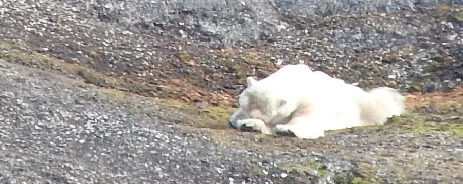 | Frigg and Maarten were going to Storholmen for the last check on hatching nests. On approach they always check the island, but this time it was not difficult to find. A polar bear on the island. We stopped and the large zoom of Maartens camera made pictures as if the ebar was close. Nevertheless, on the picture without zoom, you can see the head of Frigg and a yellowish dot between two snow fields, which is the bear. | |