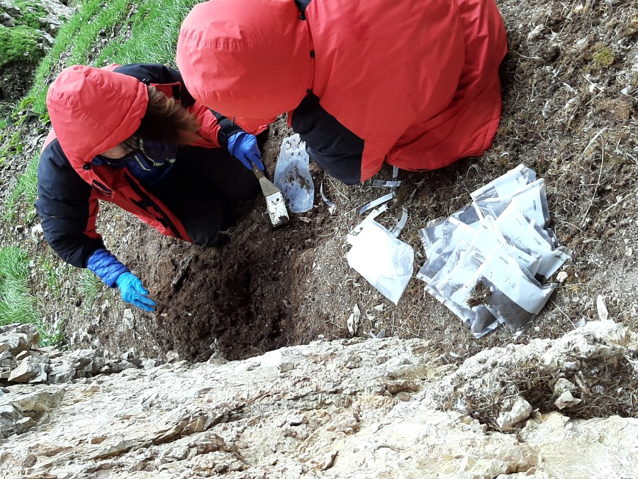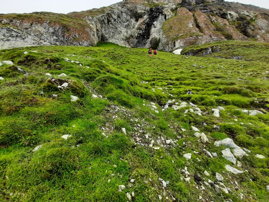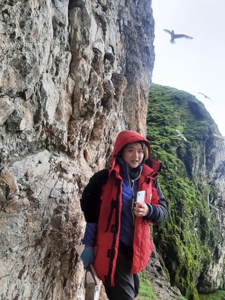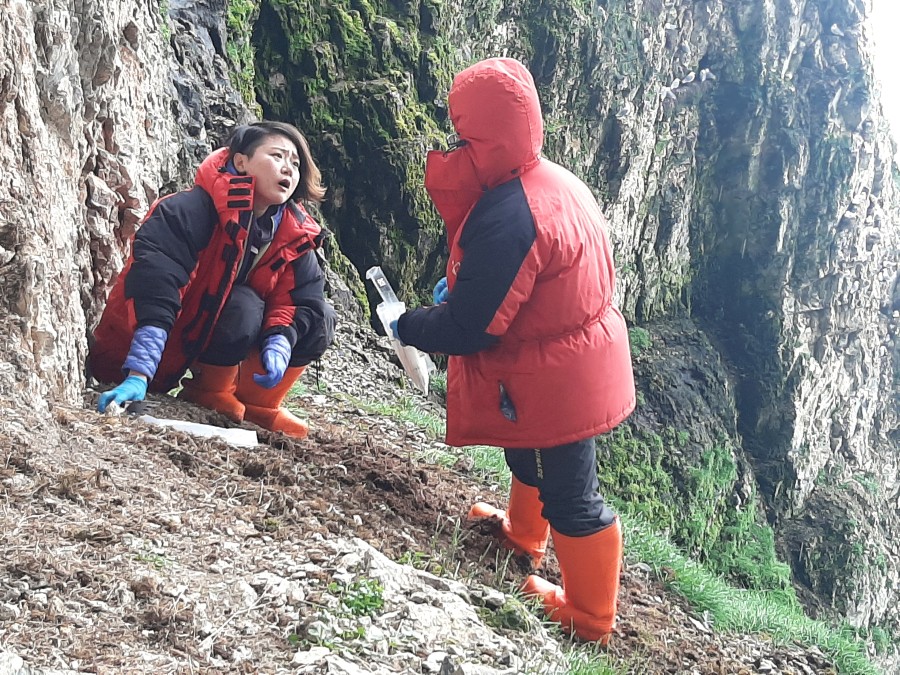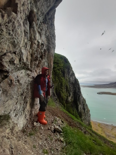 Jin Shuoichen en Gao Hui willen een kolom vogelpoep verzamelen om de geschiedenis te reconstrueren van bepaalde stoffen en genen. Eerder hen ik hun collega geholpen met bemonstering van krikjefjellet. Ik breng hen nu naar de drieteenmeeuwkolonie op Blomstrand. Het is een steile maar succesvolle klimpartij. | |