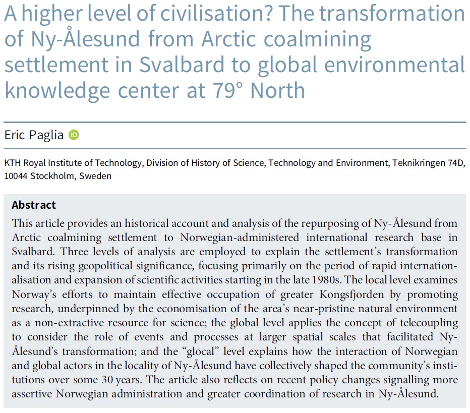 | In Polar Record is een interessant artikel verschenen wat de recente trandsformatie van Ny-Ålesund beschrijft tot een internationaal centrum van poolonderzoek. Paglia E. (2020) A higher level of civilisation? The transformation of Ny-Ålesund from Arctic coalmining settlement in Svalbard to global environmental knowledge center at 79° North. Polar Record 56(e15): 1–13 Het volledige artikel is hier te vinden. | |