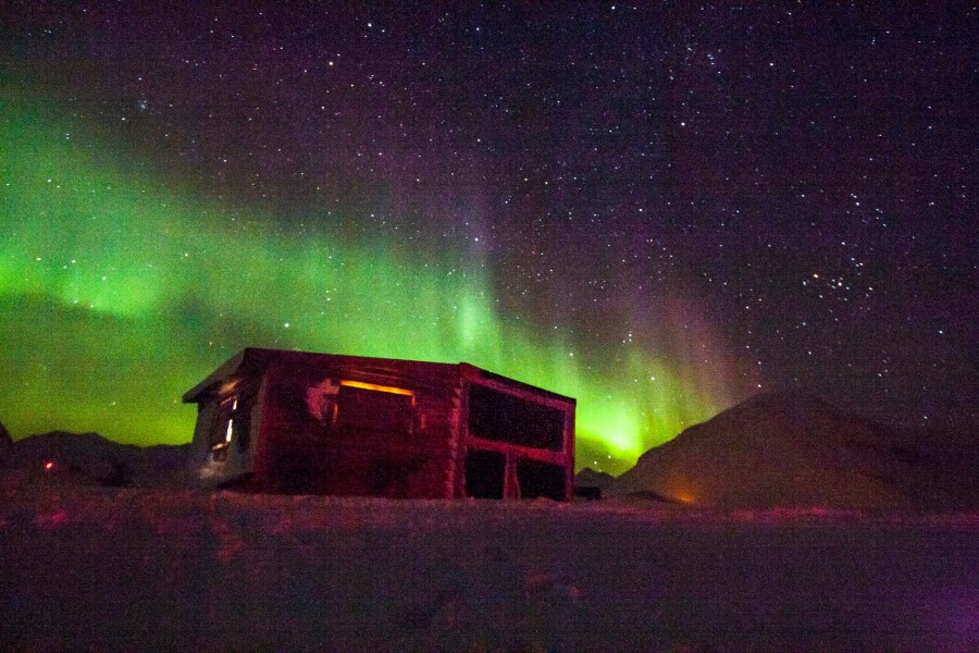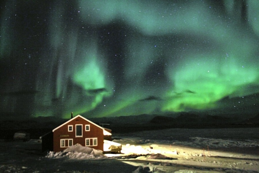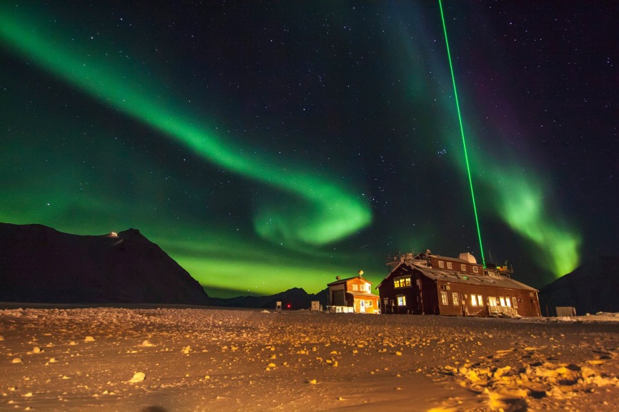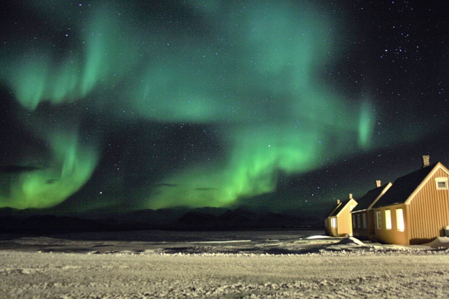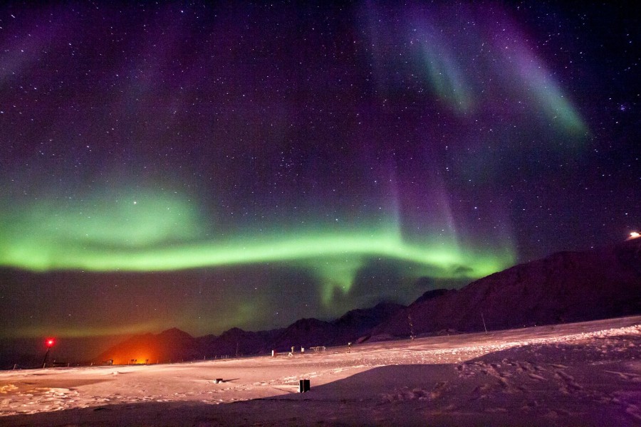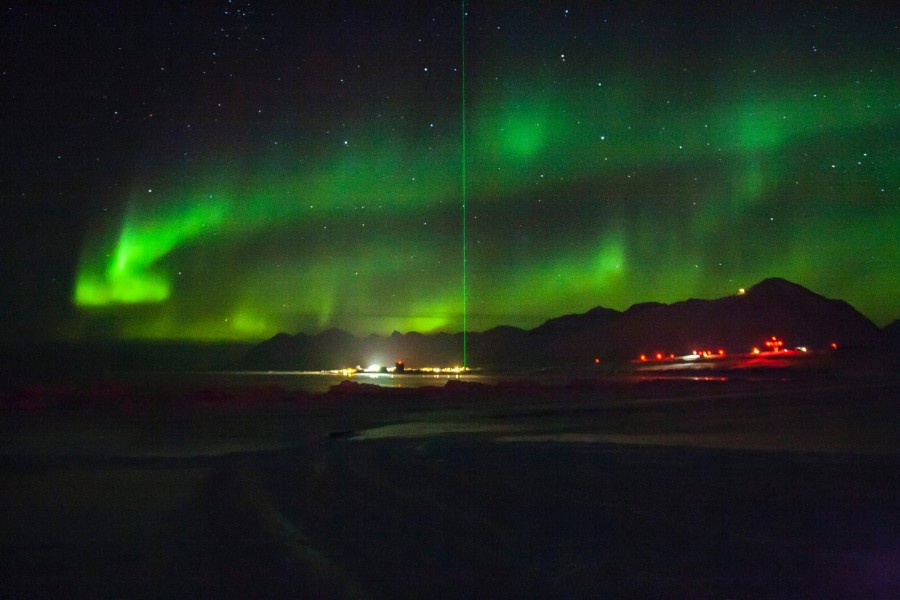 In de zomer, wanneer de zon de gehele dag schijnt, is het nooit te zien. Maar nu in de donkere tijd geeft het een fantastisch beeld als er veel uitbarstingen zijn van zonnewind. Op de foto, met een lange belichtingstijd staat het stil. In het echt beweegt het allemaal. Het zijn moleculen in de hogere atmosfeer die geraakt worden door de geladen deeltjes uit de zonnewind en weer terugvallen in energie door het uitzenden van licht. In Ny-Ålesund is het noorderlicht in het zuiden te zien, omdat de zonnewind de atmosfeer binnenkomt in een cirkel rond de magnetische noordpool. Deze ligt te dicht bij Spitsbergen en het dorp ligt daardoor binnen de ring. | |