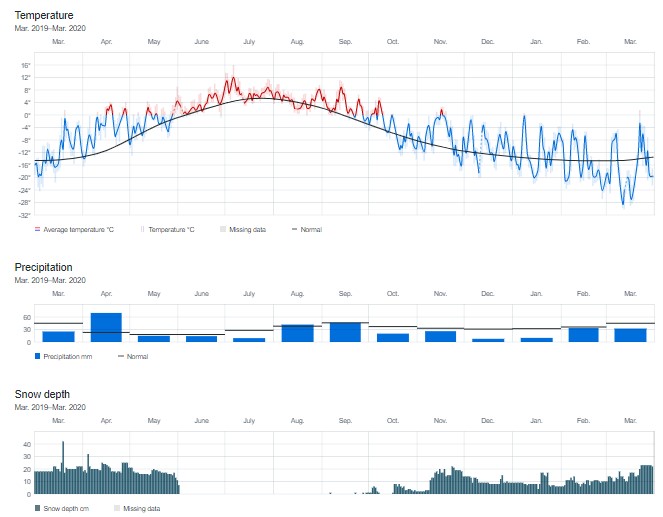 Links een grafiek van de website van het Noorse meteorologisch instituut yr.no. Meer metingen vanaf Spitsbergen zijn hier te zien. In de recente jaren waren er steeds periodes met temperaturen boven nul in de winter, die samenvielen met een grote hoeveelheid neerslag. De totale jaarlijkse neerslag werd 3 keer meer en de grond werd bedekt door ijs, zodra die regen bevroor. Nu is er al de hele winter sneeuw en lijkt het een ouderwets koud voorjaar te worden. |