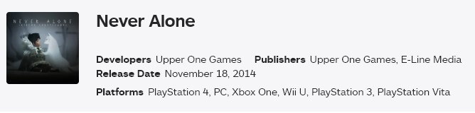 Never Alone is een puzzel-avonturen-video-spel gebaseerd op een orgineel verhaal van de Iñupiaq, een volk van de kust van noord en noordwest Alaska. Als speler varieer je tussen de rol van een Iñupiaq meisje Nuna and haar metgezel, een poolvos. Ik had het spel voor een paar euro gekocht op mijn telefoon om meer te leren over de nieuwe manieren waarop de inheemse volkeren hun kinderen leren over traditionele waarden. Vandaag heb ik het spel gespeeld totdat ik vast zat omdat ik steeds aangevallen werd door een ijsbeer. Toen kwam ik er achter dat deze video's laten zien wat er in het spel gebeurt. Om een beetje reclame te maken voor dit spel, heb ik de video's hier bij elkaar gezet. Als je op een plaatje klikt begint de video. | |