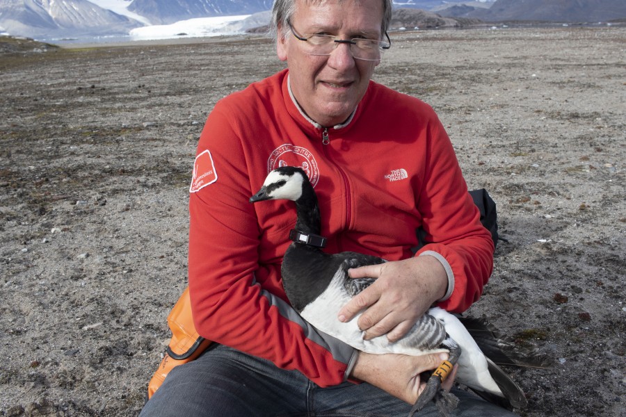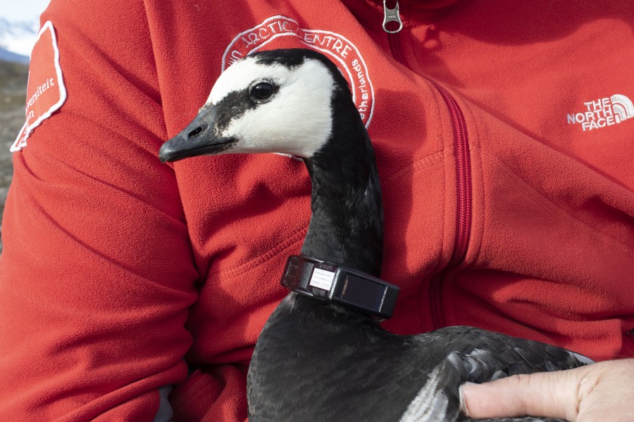 We have permission to equip 24 birds with GPS neck collars. They take the geographical position of the goose every 15 minutes for several years thanks to two solar panels. As soon as the bird is in reach of mobile telephone, the data will be transmitted automatically.