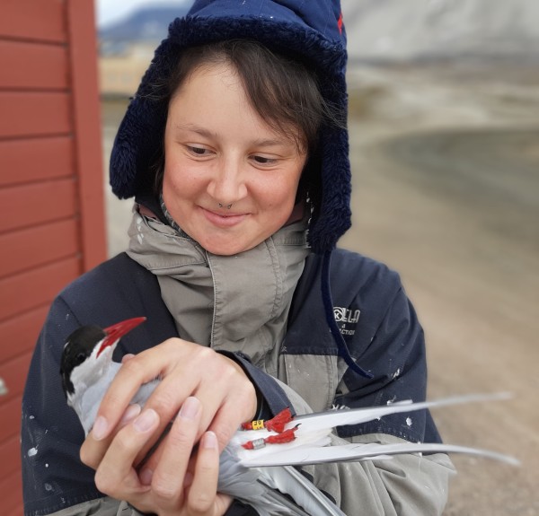 | With individually coded plastic rings, we give the arctic terns individual identity. But the rings on these small legs are not easily readable. We have to catch the terns to be sure. Catharine Uth is helping. | |