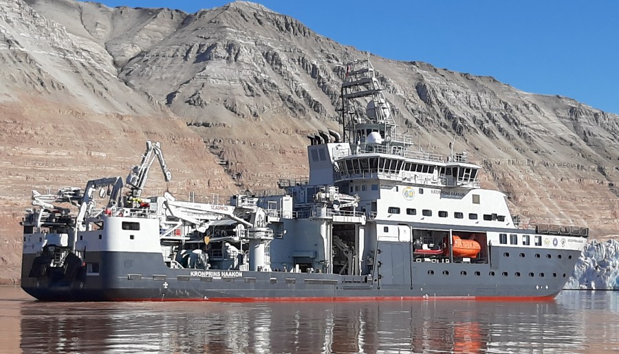 We meet de Norwegian icebreaker Kronprins Hakon in the fjord. The boat is studying the glacial run-off from the Kongsbreen glacier. The water coming from the glacier is full with sediment. the run-off floats on top as it is cold fresh water floating on heavy salt water. | |