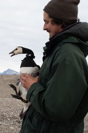 After waiting for two hours, the geese have emptied their intestines and we can start ringing. We also attach some GPS neckbands.