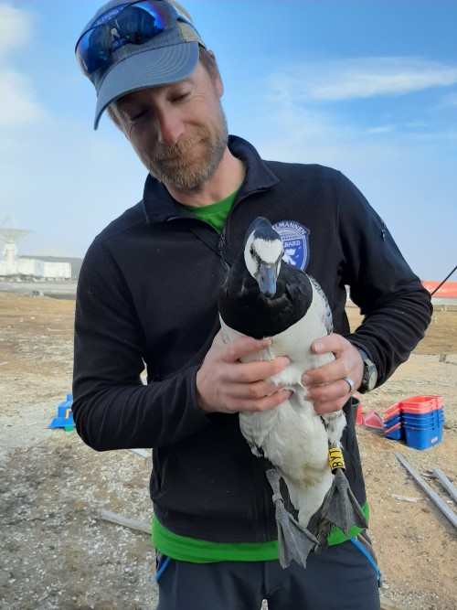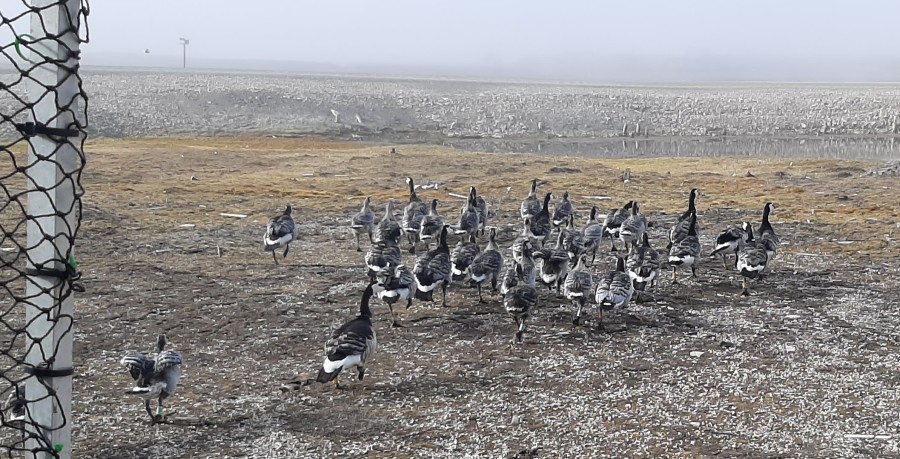 We still have to attach 4 GPS neck collars. So we plan a fourth barnacle goose catch. It is a foggy morning but we locate the geese behind the village and are able to bring them to the nets. We get help from the local biologist of Sysselmannen: Fredrik Samuelsson. He helped as a student with a UNIS catch on Storholmen several years ago. It is always a nice moment when we can release the geese again. | |