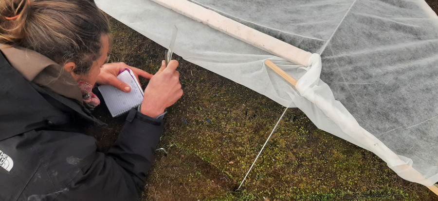 | Mo is measuring the grasses in his shading experiment. He is now working together with Emanuele Pallozzi, who has an instrument to measure photosynthetic activity at different light levels. This is a unique and relevant addition to the experiment. Hopefully it works on the tiny grasses. | |