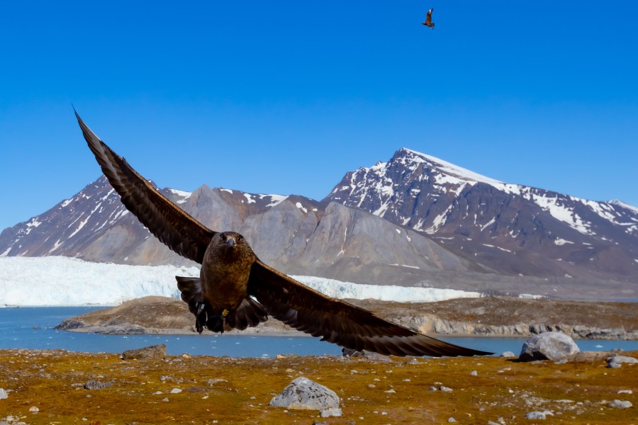 | In Kongsfjorden many birds are ringed. Also this skua. With a ring yellow XX and a geolocator on the other legg to register the migration route. | |