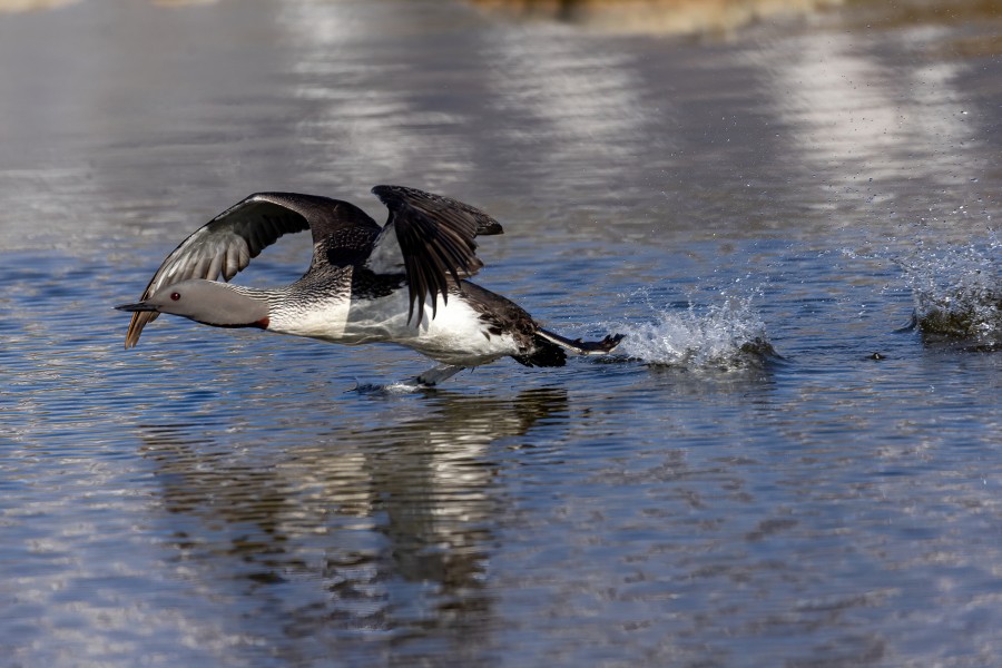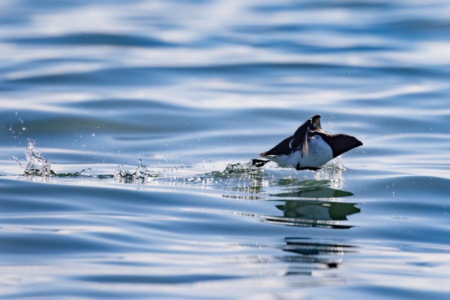 | Op de terugweg worden zeevogels gefotografeerd. Hier een kleine alk, die net als de roodkeelduiker op de foto hierboven over het water loopt om in de lucht te komen. | |