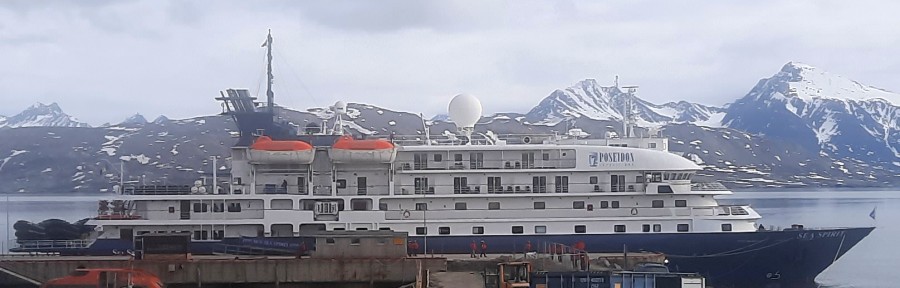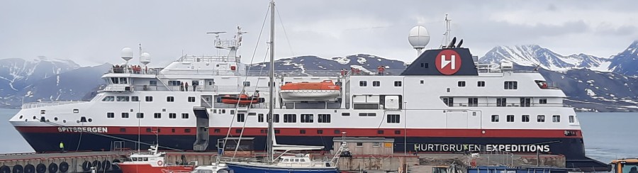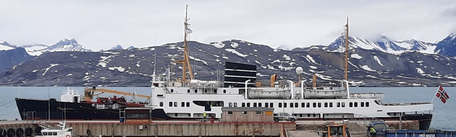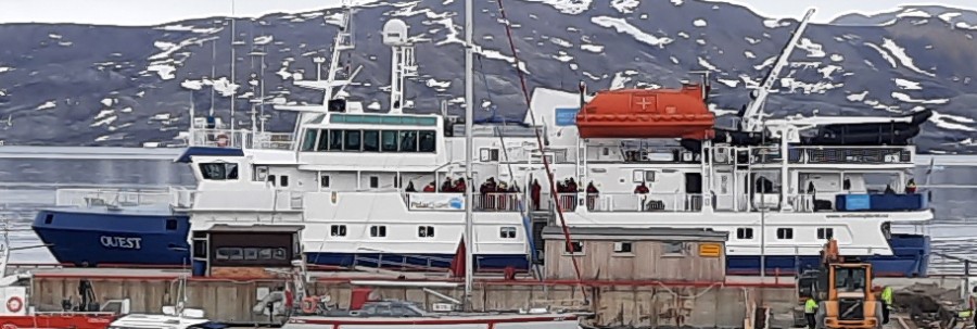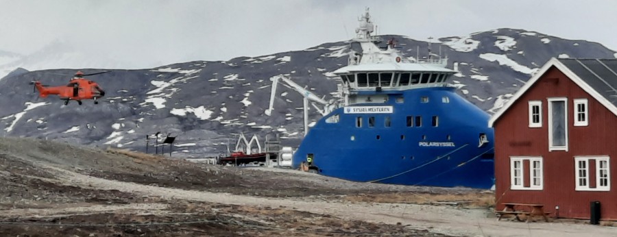 | 15 juni 16:47 Polarsyssel: geen toeristen maar het schip van de gouverneur, terwijl juist een helicopter op het achterdek landt. | ||