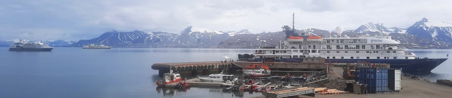 | En dan zijn er nog twee grote boten in het fjord, die hun toeristen aan land brengen met kleinere bootjes. | ||