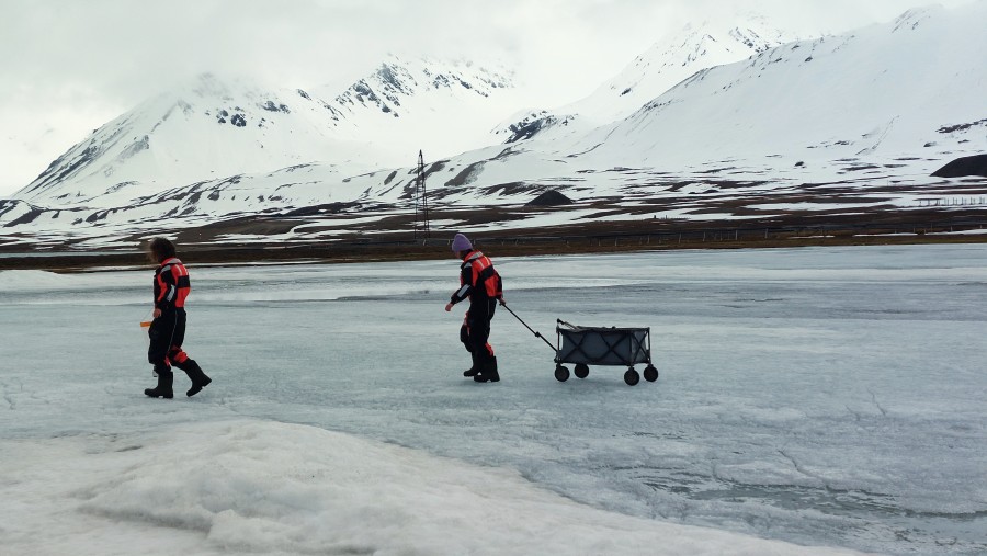 | Tijdens de eerste bemonstering van het meer Solvatnet op zoek naar fyto- en zooplankton en sieralgen was het meer nog voor 85% bevroren. Lisa en Roos zijn twee masterstudentes van het Arctisch Centrum van de Rijsuniversiteit Groningen. Lisa gaat de monsters analyseren met behulp van onzze eigen omkeermicroscoop. Daarmee kijkt ze vanaf de onderkant naar het dekglas, waarop het plankton is gezonken. | |