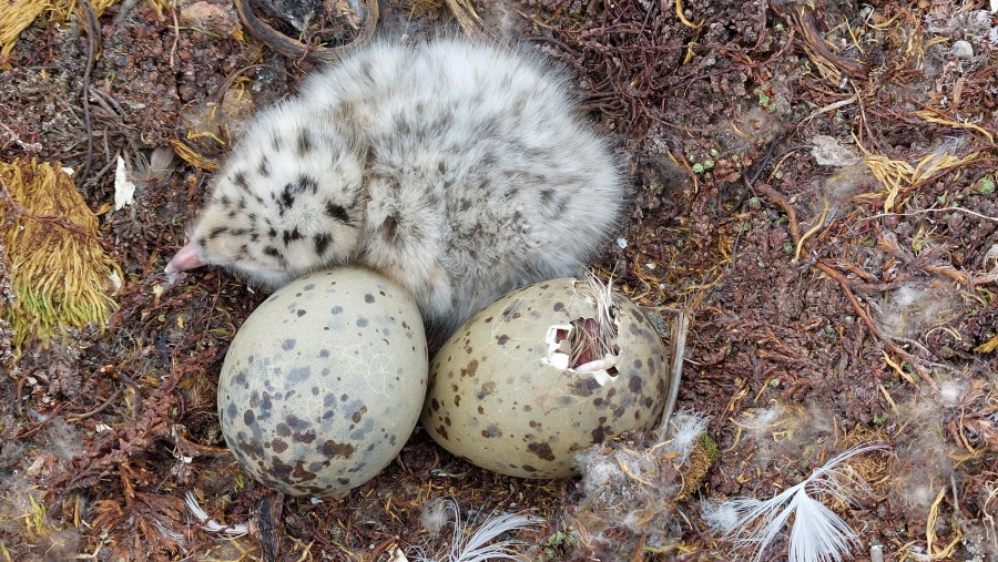 | Below: We also find a nest of a Glaucous Gull. This species has asynchronous hatching. In the nest there is a dry chick, an egg with a hole and an egg with a star. The young will have different ages, and the oldest will be dominant. In case of food shortage that is the only one which will survive. | |