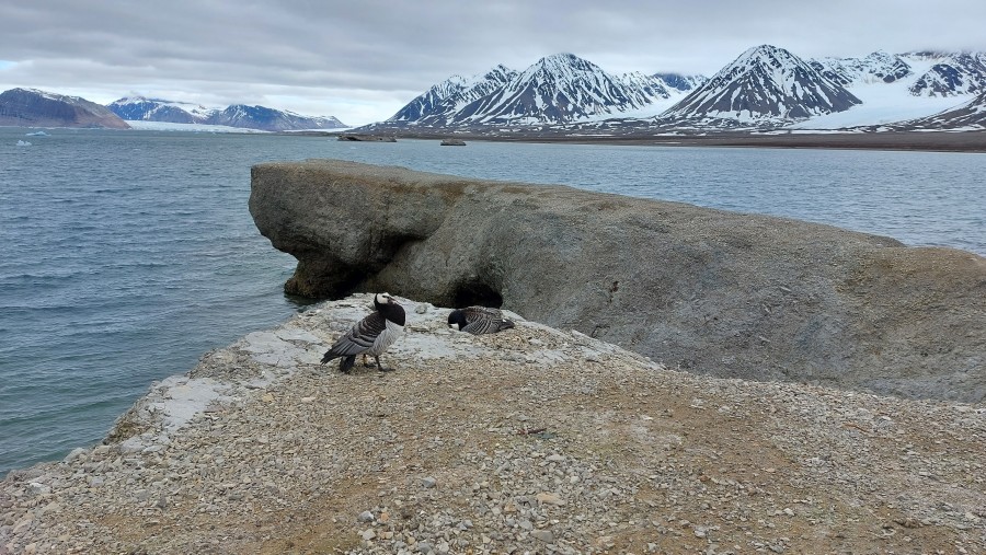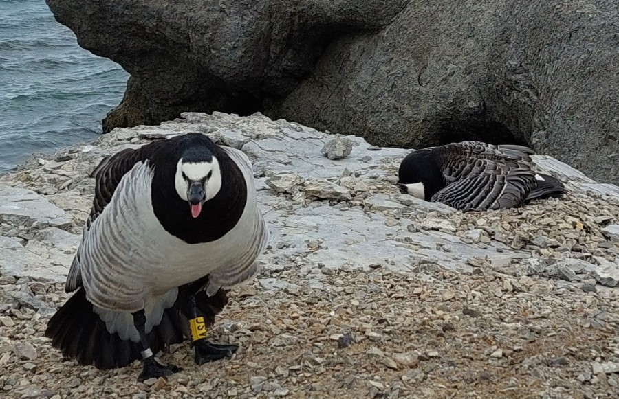 This is a sad story of love and endurance. On Prins Heinrichsøya is on the most easterly nest a female laying dead. Because of the outbreaks of avian influenza all over the world, we want to sample this bird. Maarten climbs to the nest, with sampling swabs and tubes and protective mask and handkerchiefs. He samples both the oesophagus and the cloaca, front and buttock of the goose. | |