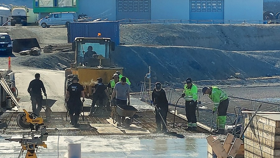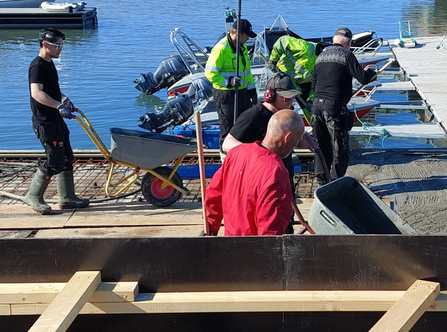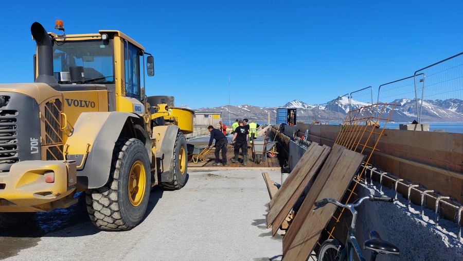 Vorig jaar was er een prachtig betonnen plateau gemaakt in de haven, maar gedurende de winter bleken er twee kwaliteiten beton te zijn gebruikt. Een deel van het dek brokkelde af door de vorst. Daarmee was er weer veel werk te verzetten, maar het bracht ook weer een mooie ploeg oldtimers naar Ny-Ålesund | |