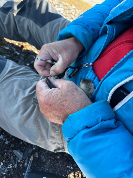 This year is a late year, with low number of nesting seabirds. Goose nests are hatching, and we go to Storholmen to collect 16 goslings for an experiment on mercury exposure. The experiment is designed by Nico van den Brink of Wageningen University. Only in the Arctic, we can find levels of mercury still low enough to act as a control. Nico is here with two of his PhDs and Shivani Ronanki made the pictures below. | |||||