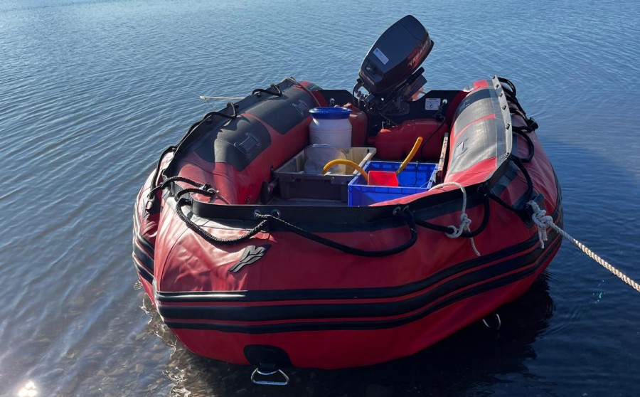 ![]() The boat was waiting for the girls in calm waters with two anchorlines. The front is deflated. | |