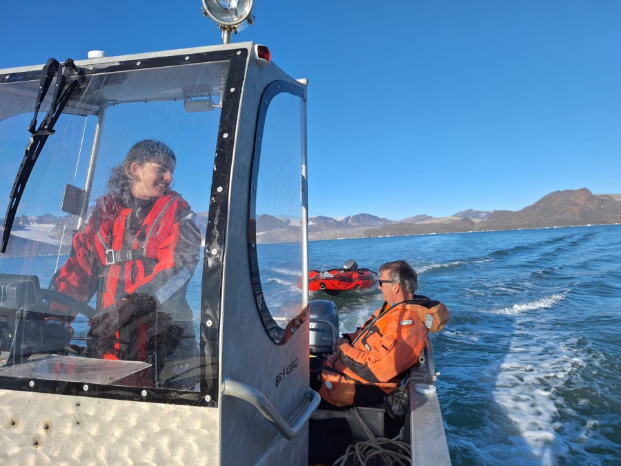 Maaike, Susanne and Chivani are going on a trip to Ossian Sars. Maaike wants to sample two lakes before they have dried up and Chivani can do something else for a day than caring for the goslings. Ossian Sars is one of the most beautiful places in the fjord. The weather is calm and Maaike is trained with boating. They call over the radio just before dinner. The zodiac has a deflated front. Maarten will go to the rescue with an aluminium boat of AWIPEV. | |