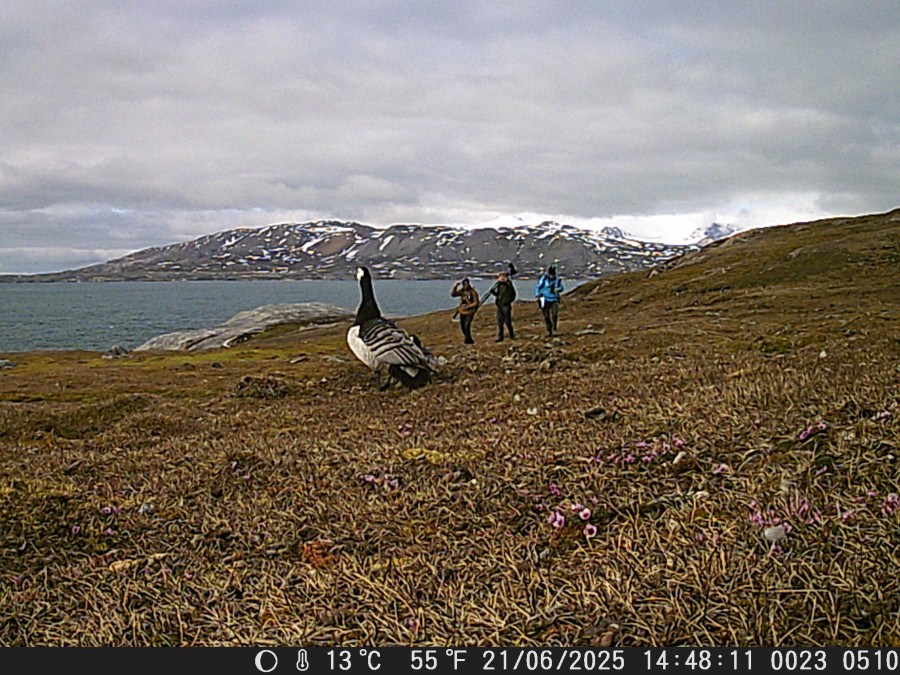 Guido Klep is studying nest site quality. One of his projects is analysing a time-lapse wildlife camera near a nest to study nest attendance by the male and female barnacle goose. While going through a large collection of pictures, he has also found some pictures where we are visible approaching the nest. Maarten (blue coat) looks at all three pictures on his GPS to locate the nest. No female goose on any of the pictures.