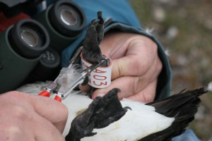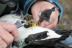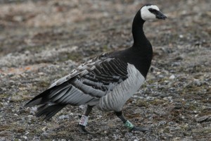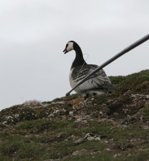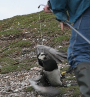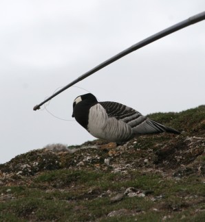 | Een aantal ganzen hebben een apparaatje aan de voet, wat hun locatie registreert tijdens de trek. Aleen moeten we de apparaatjes wel terug krijgen. Daarvoor moeten we de gans vangen en dat doen we met een hengel. Aan de hengel zit een klein stropje van nylon. Snel de logger vervangen door een nieuwe en de gans rent meteen terug naar zijn nest. | ||