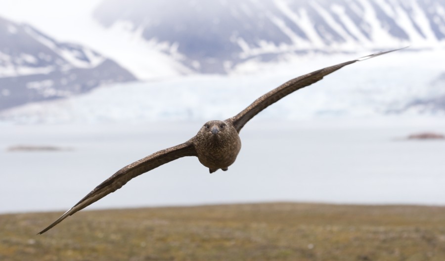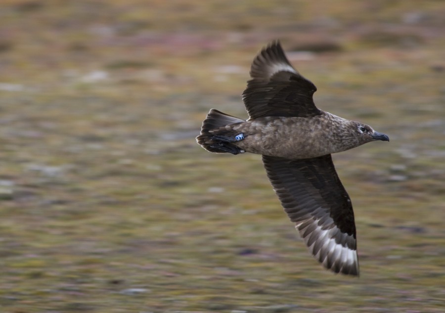 | Op dit eiland zijn zowat alle vogels geringd. De grote jager, die ons probeert te imponeren door recht op ons af te vliegen heeft zelfs een ring: blauw ZP. | |
