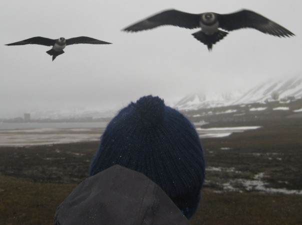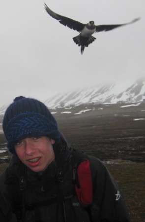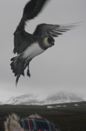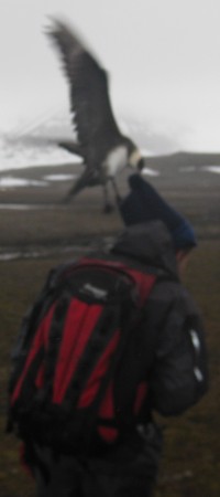 During a goose count, we are attacked by an arctic skua. The pair hangs above our head and makes a lot of noise. But than the attack starts. I am protected by a rifle sticking above my head, Fokje has a thick hat, but Janwillem is the victim. His hat is taken and he is hit on his head. Run! |
