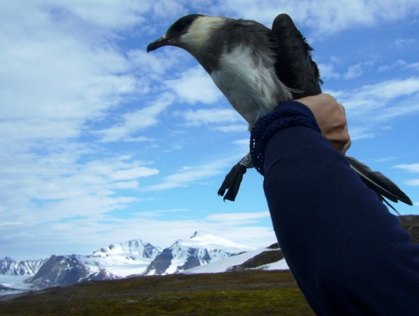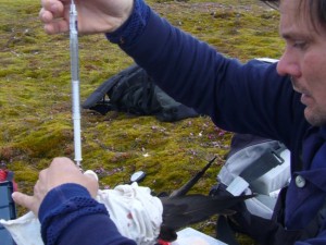 | Børge heeft samen met Thomas de afgelopen week 5 paar kleine jagers gevangen en alle 10 de vogels uitgerust met een GLS-logger. Met deze apparaatjes moet duidelijk worden waar deze vogels in de winter verblijven. Is dat de zuid Atlantische Oceaan of zelfs de Zuidelijke Ijszee? Børge en Thomas vangen de vogels met een radiografisch bediende strop, die om het nest wordt gelegd en de vogel vangt aan de poot. De laaste vogel, was de vogel die Janwillem eerder aanviel en die konden ze zelfs vangen met de hand! Klein was deze kleine jager niet. Het was een oude man, met zulke dikke poten dat er een speciale ringmaat moest worden aangelegd. | |