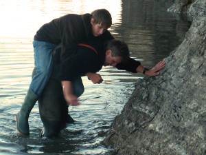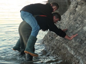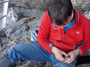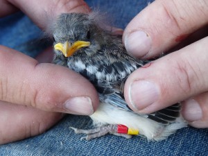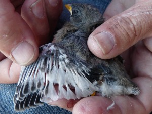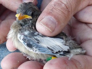 Six hours later, I go with them for a check, but the tide is high. Oebele gets a suit and carries me and Janwillem over the deepest parts of the coast. Janwillem holds the ladder and I climb to the top. Five young snowbuntings try to hide, but my arm is just long enough. The snowbuntings are really tiny compared with geese. |
