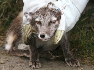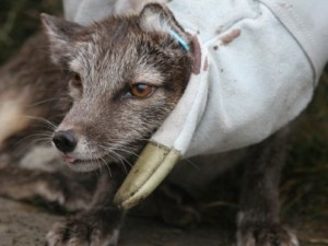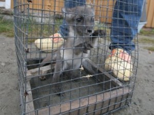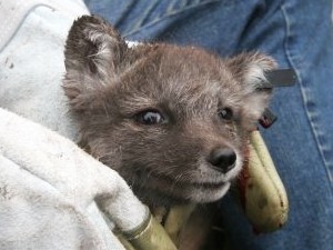 In de burcht zijn nog twee puppies. De kleine is dominant over de grote pup. Iedere keer als er een kuiken wordt aangebracht door de moeder, heeft de kleine eerste keus en jaagt de grote pup weg bij het voedsel. De grote pup laat zich moeilijker vangen. Ze loopt wel de val in en likt aan het aas, maar trekt het niet weg. Daarom heb ik een touwtje gespannen, zodat ik zelf de deur laat dichtklappen. Dat heeft meteen succes. Het is weer gelukt om beide vosjes te vangen en merkjes te geven. Ik ben benieuwd wat we over hen zullen horen. | |