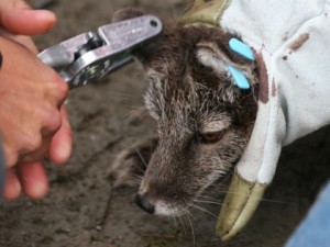 ![]() Even later vangen we de kleine van de twee puppies. Deze pup is dominant en het blijkt een mannetje te zien (zie midden hieronder). Hij krijgt in zijn linkeroor een zwarte tag en in zijn rechter oor een rode tag met het nummer 112. |