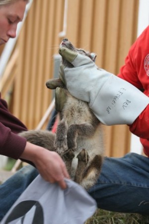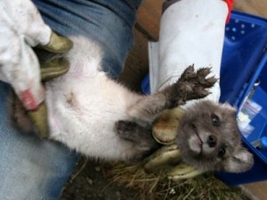 Als eerste vangen we Simon (blauw/groen), die vorig jaar hier als pup is geboren. We weten niet of deze vos ook de vader is van de huidige puppies. Simon krijgt een nieuwe groene oorbel, wordt gewogen, gemeten en snel losgelaten. | |