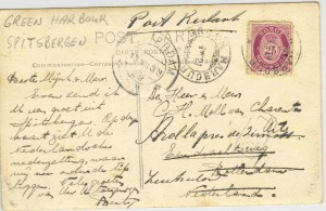 ![]() Deze brief is in 16 augustus 1958 verzonden door Jan P. Strijbos vanuit Ny-Ålesund aan de redactie van de Telegraaf in Amsterdam. De brief komt uit de verzameling van Eddy De Busschere uit Assebroek, België. Hieronder een kaart uit 1930 of 1931, die verstuurd is vanaf Spitsbergen. Op deze kaart staat geschreven: "Op deze kaart ziet U de Nederlandsche nederzetting". Het betreft Green Harbour, dat in 1932 aan de Russen werd verkocht en sindsdien bekend staat als Barentsburg. | |
