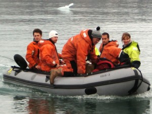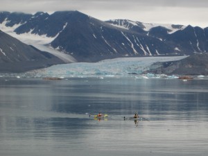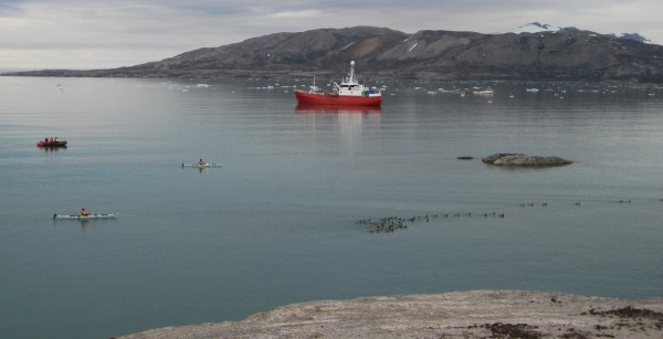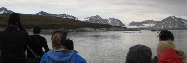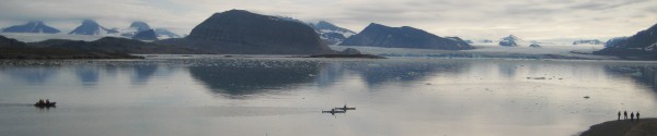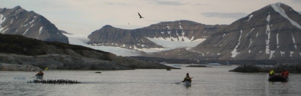 | We hadden twee mensen op wacht gezet op de heuvel, maar de kapitiein van de boot ziet hem het eerst en gebruikt de radio om ons te waarschuwen. Hij keek door de verrekijker naar ons en zag ineens in de achtergrond op het volgende eiland een ijsbeer lopen. Er is geen enkele discussie want de veiligheidsprotokollen van UNIS en het Nederlands Poolstation zijn duidelijk: wegwezen. De studenten doen meteen hun survivalpakken aan en worden met zodiacs teruggebracht naar de boot. Terwijl de ijsbeer steed sin het zicht wordt gehouden laten wij de ganzen los en ruimen de netten op. De beer zwemt op 500 meter van eiland naar eiland en binnen 30 minuten is alles opgeruimd. Anouk en Fokje varen de kano's terug naar de boot geëscorteerd door een motorboot met Thomas en Elise. Janwillem geeft ze wat extra vaart mee door nog even te zeggen dat de ijsbeer er aan komt. | |||||||