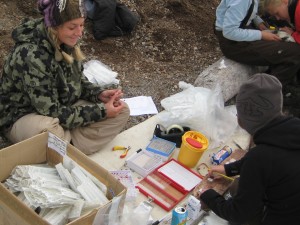 | Ik meet ganzen achter op de foto, terwijl Thomas de studenten leert bloedprikken. | |||||||