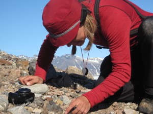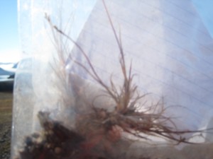 Inger Alsos, een plantenecologe met wie ik lang geleden aan ganzen heb gewerkt, is op zoek naar een zeldzaam gras dat slechts één keer eerder op Spitsbergen is gevonden en beschreven als een endemische soort kweldergras: Puccinellia svalbardensis. We gaan samen op zoek op Sigridholmen. Ze heeft er een goede neus voor en vindt 9 onooglijke en verdorde polletjes. In ieder geval kunnen we concluderen dat het gras op zijn natuurlijke standplaats niet snel ten prooi zal valln aan ganzenvraat. Een klein deel van de planten wordt verzameld voor beschrijvingen en DNA-analyses. | |