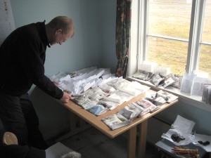 | Wat een landschap..... | Boven op de vogelklif | De oogst, tafels vol met convoluten, zoals ze de witte zakjes noemen waarin de mossen worden gedroogd en opgeslagen. |
