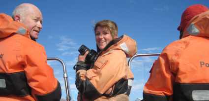 | Every boattrip, we have to wear survival suits. The water in the fjord is only 2 degrees Celsius, so you will feel paralyzed soon when dropped in the water. To get customized to the suit, I organise a swim. It is also a good check for leakage. | ||