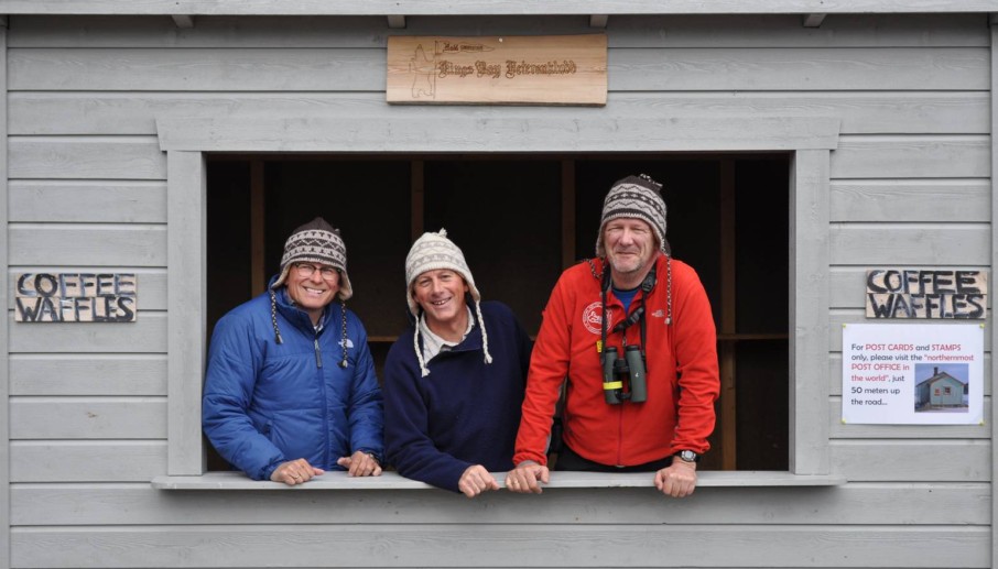 | The Veteran club of Ny-Ålesund consists of miners and former emloyees of Kings Bay and their children. Every summer, they run a small shop and sell coffee and waffles. They are very nice friendly people. This year Geir Wing Gabrielsen, Nick Cox and Maarten Loonen got a beautiful self-made woolen hat from Lilly Kristensen. We made this picture to thank her. | ![]() |