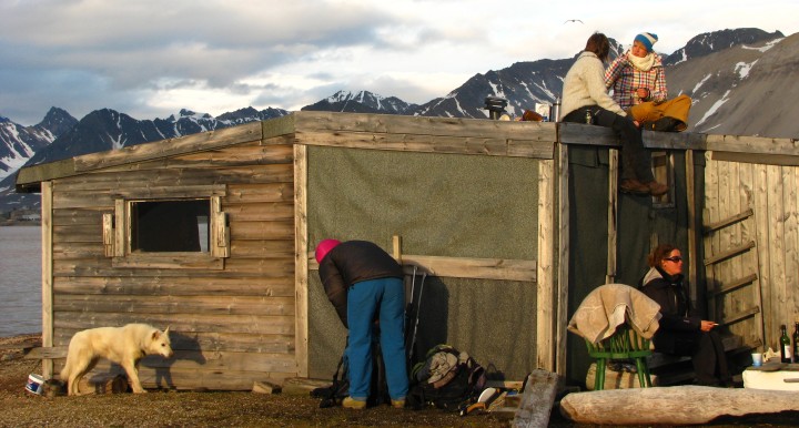 Het lijkt op deze foto net of er een beer om de hut komt, maar gelukkig is het een vriendelijke sledehond. Overigens is het dak vaak een veilige plek tijdens een beerbezoek. |