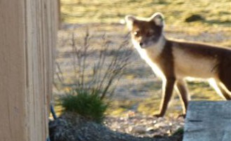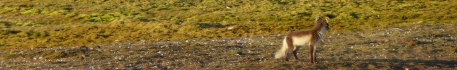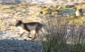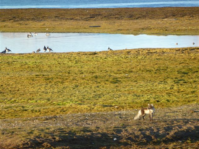 Randi wordt meestal gezien ver ten oosten van het dorp, maar dit is de derde waarneming in het dorp. Hier eet ze voornamelijk kuikens van de noordse sternen. Tot nu toe hebben we nog niet gezien dat ze ganzenkuikens ving. Links zie je de kleurmerken in haar oor. Linkeroor groen, rechteroor geel. |
