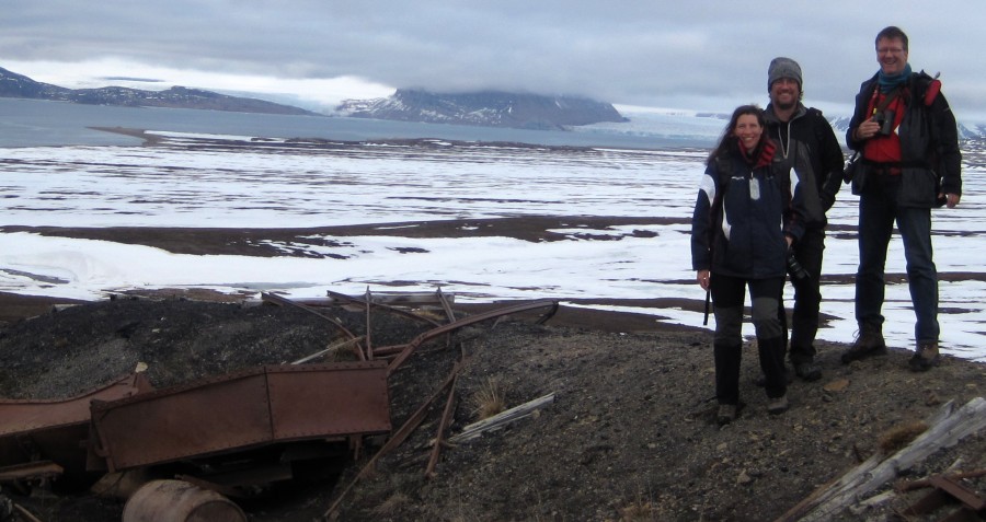 | Sinds maandag waren Nico van den Brink en Martine van den Heuvel van het instituut IMARES in Wageningen al in het station aanwezig. Ze hadden het dorp verkend en een eerste keer zeebodem bemonsterd met de lokale onderzoeksboot Teisten. Nu ik ben aangekomen, konden ze ook op verkenning buiten het dorp. Vanwege het risico van een ijsbeerontmoeting gelden speciale veiligheidsmaatregelen en een specifieke training. We zijn naar het gebied van de steenkoolmijnen achter het dorp geweest. Er heerst daar een wonderlijke sfeer omdat de mijnen halsoverkop gesloten zijn na een hele reeks dodelijke ongelukken. Overal ligt kool, maar ook treinwaggonnetjes, stukjes rails, hout en allerlei roestend gereedschap. Op de foto van links naar rechts: Martine, Nico and Maarten. Martine schrijft ook een blog op de IMARES webpagina: http://www.imares.wur.nl. | |
