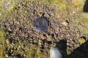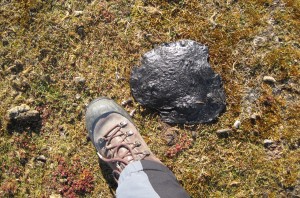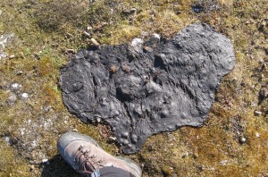 | Some days ago, we had several polar bear sightings in the fjord. Now we find traces of these visitors. To the left a foot print on the beach near Gåsebu (head of Hielke for size) and to the left polar bear faeces found on Storholmen. There is clearly a disturbed digestion after eating bird eggs. | |