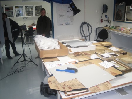 dat ze eigenlijk gewone Nederlandse kleren droegen in de koude hier op Spitsbergen. Vooraf aan de opgravingen was afgesproken dat de helft van de vondsten voor Noorwegen zou zijn en de andere helft voor Nederland. In het vernieuwde Rijksmuseum is ook een prachtige collecte van wollen mutsen te zien. Maar er waren nog een aantal vondsten in Nederland, die terug moesten naar Spitsbergen. Vandaag hebben Margje en ik een wollen muts, broek en wat ander materiaal vanaf de Ortelius naar het depot gebracht. Daar werden de stukken meteen gecatalogiseerd en gefotografeerd. | |