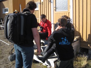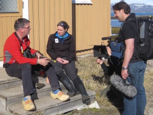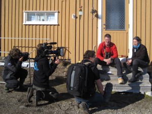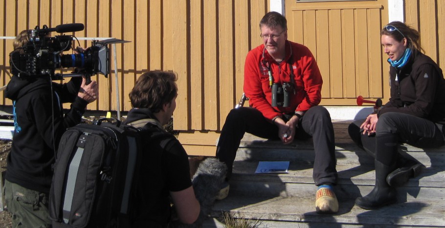 One of the touristboats has a camera team together with Gert Polet and Femke Koopmans of the World Wildlife Fund (WWF) on board. They make a short stopover in Ny-Ålesund and take some shots. They ask us about our approach towards polar bear encounters. After having heard our story, they want to tape it. On the doorstep of the Netherlands Arctic Station I discuss with Femke Koopmans how to reduce danger for the polar bear and humans. WWF will use the clip on their websites for the campaign arctichome, which they have initiated with Coca Cola. Hopefully their campaign will also generate some funds for polar bear researchers from the Netherlands. | ||