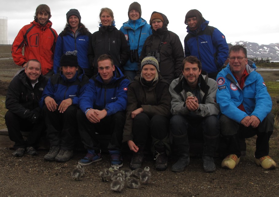 | All members of the Netherlands Arctic Station on a group picture. From left to right on the top row: Tim, Martine, Suzanne, Gigi, Isabella and Ariadne. On the middle row: Ruben, Bas, Ben, Margje, Ramsey and Maarten. Bottom row: our goslings. Tomorrow Bas, Ruben and Martine will return to the Netherlands. | |