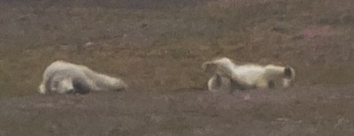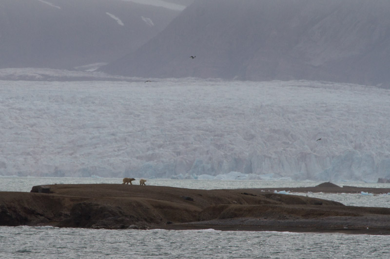 Ben ik weer... Dat moeten deze beren gedacht hebben. Ze waren al op 12 juli op weg naar het dorp. Nu proberen ze het opnieuw. Weer werden ze weggejaagd naar Prins Heinrichsøya. Daar zitten ze 's avonds nog. |