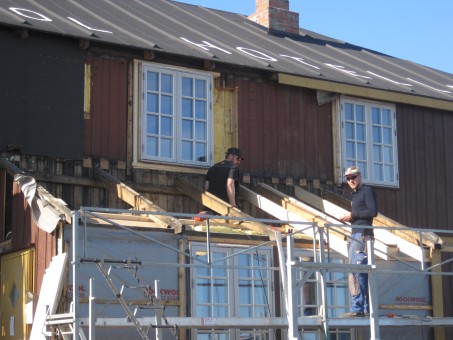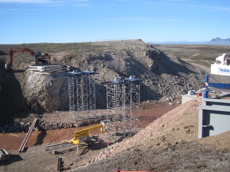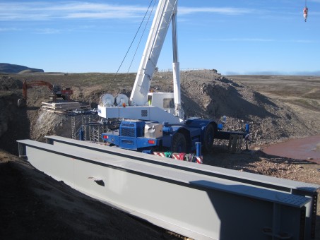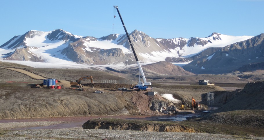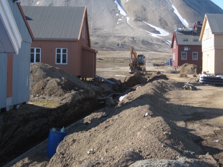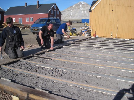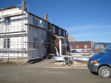 They make it possible for all of us to do science. While walking outside on this beautiful day, it is obvious how much work is done during the summer. Above, they are building a new bridge over the Bayelva river, to connect the planned new telescope to town. Below, they are renovating my former station hut. | |